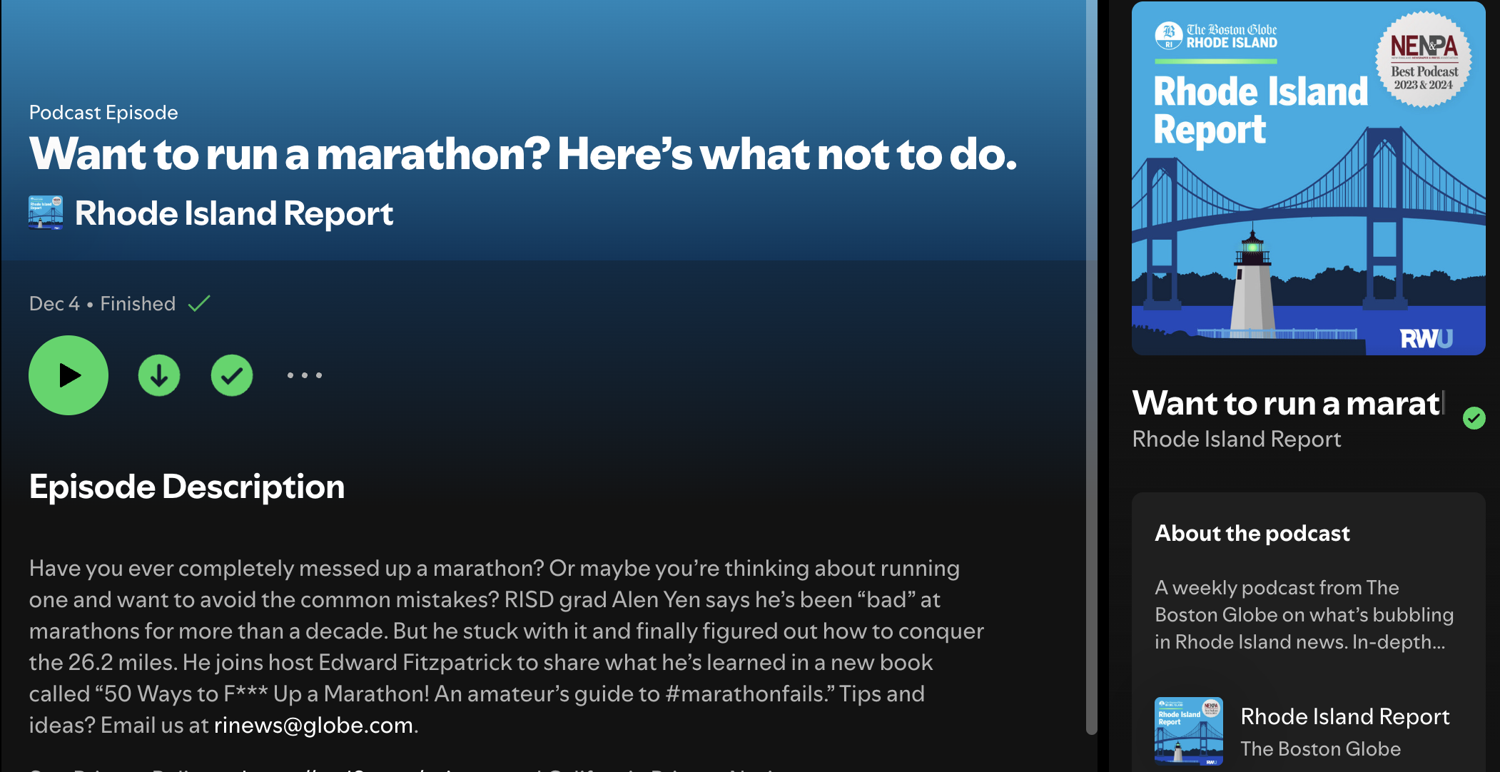 It’s here! My podcast session with Ed Fitzpatrick of the The Boston Globe RI Report! Super grateful to Ed and his team for a fun conversation, and to Michael Masseur of RDW Group for connecting me with a new run buddy. Please check it out at the link below, or on Spotify or Apple Podcasts.
